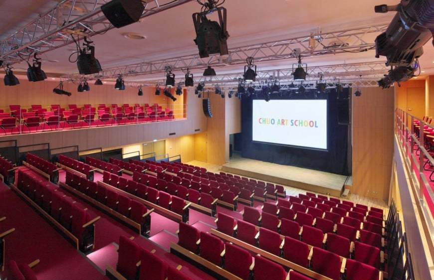 可動式の座席を含めて330人収容のホールは、プロ仕様の最新照明・音響施設が完備されています。将来プロになったときと同じような環境で学ぶ